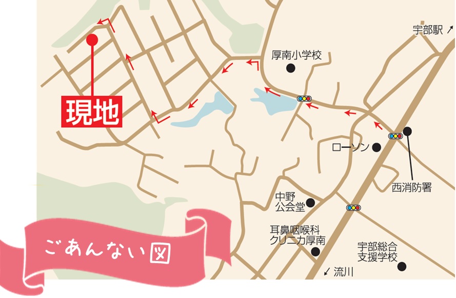 東須恵新築平屋住宅 価格 3,600万円 住所 宇部市大字東須恵181-5-付近 物件資料を印刷する 間取り3LDK 土地314.04㎡ 建物97.71㎡ 構造木造瓦葺平家建 築年月令和8年4月中旬予定 駐車場有(並列駐車5台可) 地目宅地 用途地域第1種低層住宅専用地域 建ぺい率40% 容積率60% 設備◆土地の広さ約95坪! ◆リビング24帖&開放的な勾配天井 ◆車5台分並列駐可 ◆緑と池が眺められるワイドルーフ付タイルデッキ ◆リビング電動シャッター装備 学校区厚南小700m・厚南中950m 交通JR宇部線「宇部」2,600m 宇部市営バス「中野」1,000m 入居予定年月相談 取引形態売主 この物件へのお問い合わせ